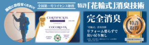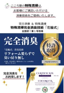 こころ屋は 全国花輪式完全消臭連盟(全花連) に加盟し、特許取得済みの「花輪式完全消臭技術」で特殊清掃を行っています。