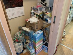 そして、作業をしていて毎回思うのが、カップラーメンなどの保存食やトイレットペーパーやティッシュペーパー等が大量に保管されており、オイルショックを経験している世代はこういった傾向が目立つ気がします。