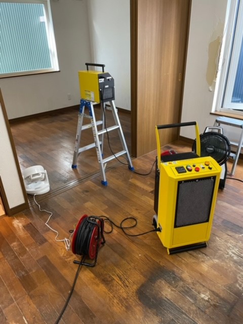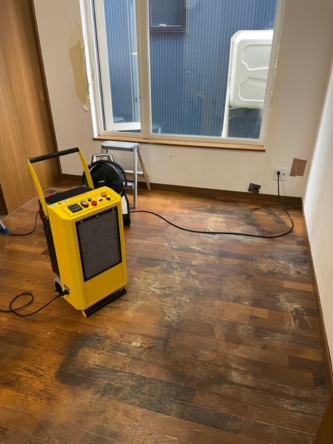 強い臭気の中、お部屋の中の不用品を全て搬出したあと簡易清掃をし、このあとの解体作業に備えるために荒消臭作業です。