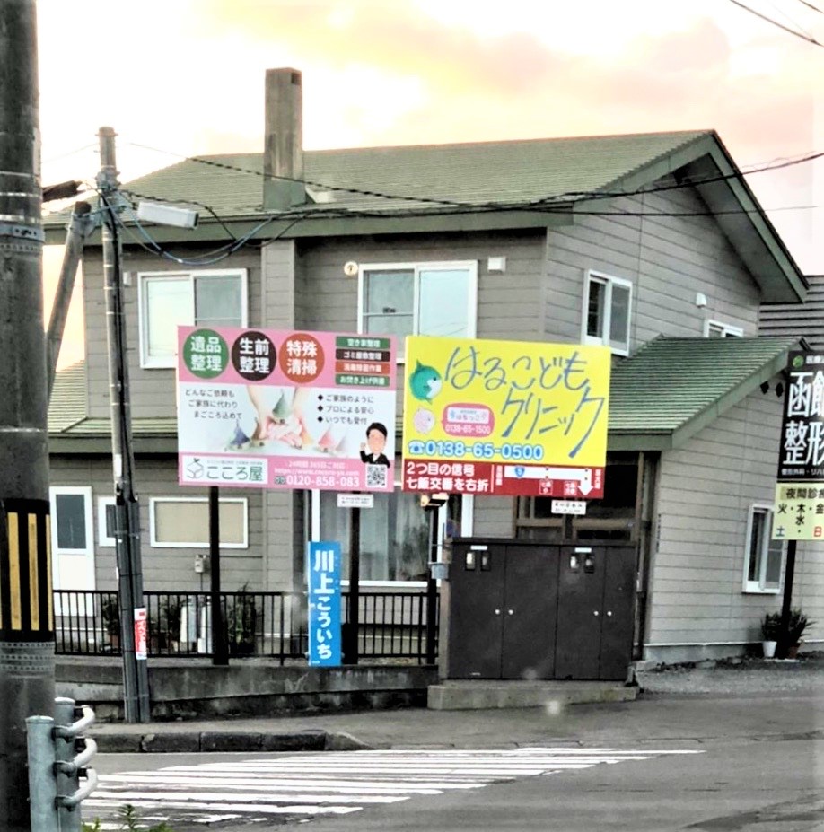 ■ お知らせ亀田郡七飯町本町の交差点です。ぜひ、私の顔を探してください(笑) このたび、こころ屋の看板を設置いたしました。 場所は、亀田郡七飯町本町の交通量の多い交差点です。 はるこどもクリニック様のお隣に設置させていただきました。 こころ屋では、遺品整理、生前整理、特殊清掃はもちろん、 空き家整理、ゴミ屋敷整...