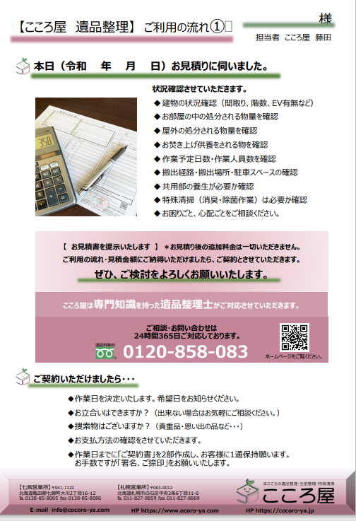ご安心ください。こころ屋では、正確な金額が記載されている「御見積書」の他に「ご利用の流れ」を書面で提出しております。