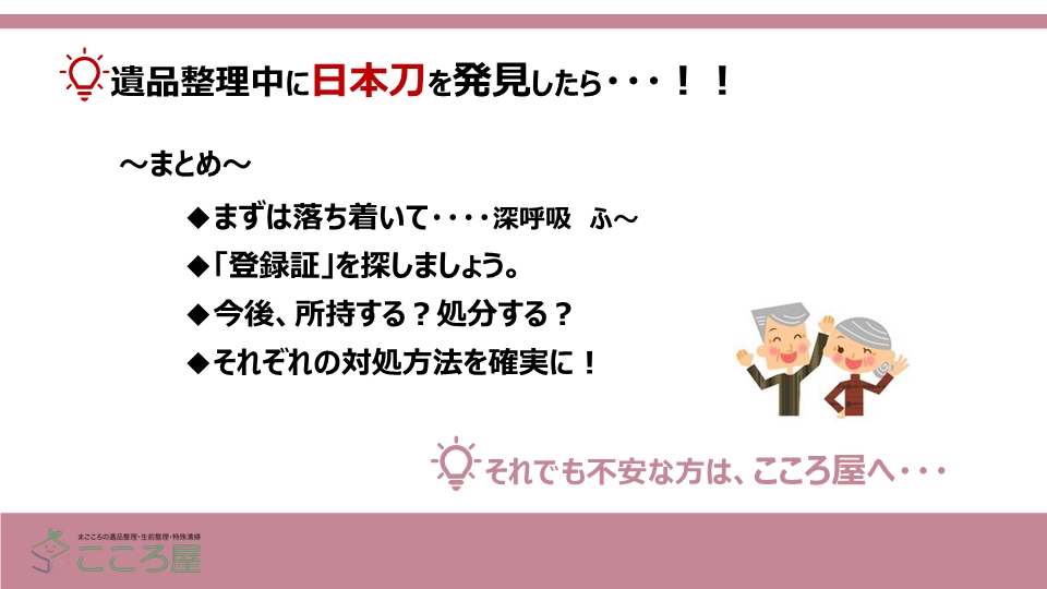 これで、皆さんもご実家などで、日本刀や刀類をみつけても落ちついて対処できますよね。
