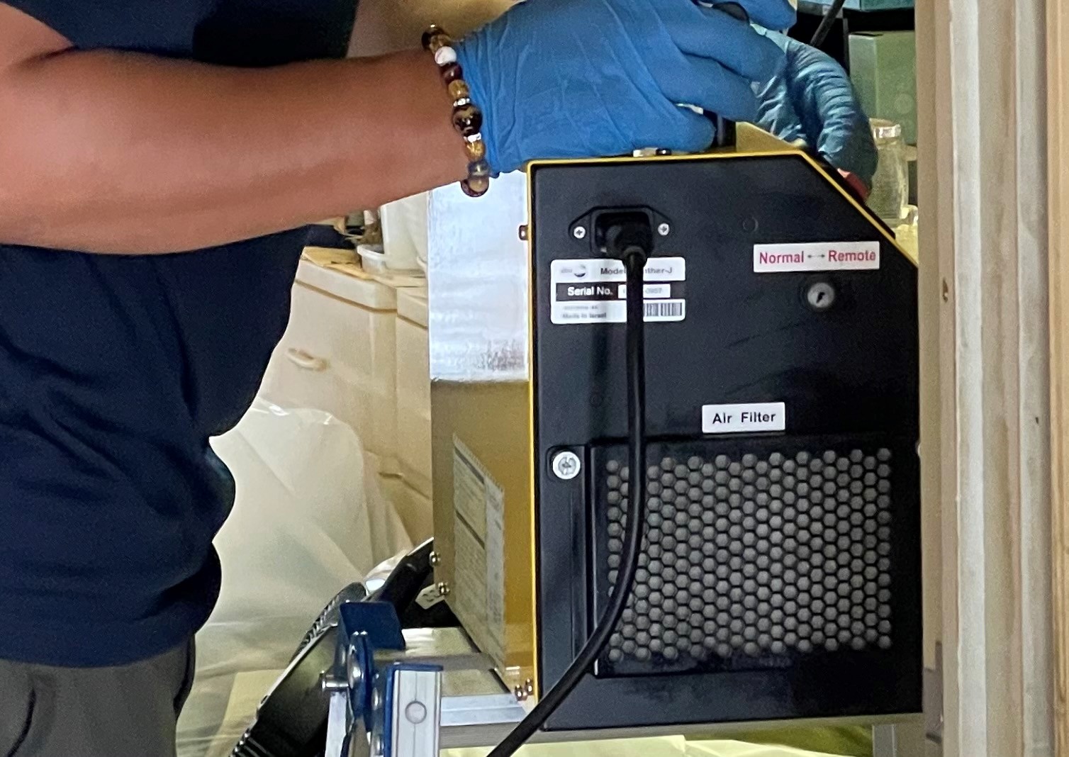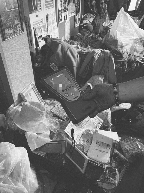 臭気の軽減と作業員の衛生管理のため、オゾン発生機による燻蒸作業を行い、翌日の家財搬出作業に備えます。